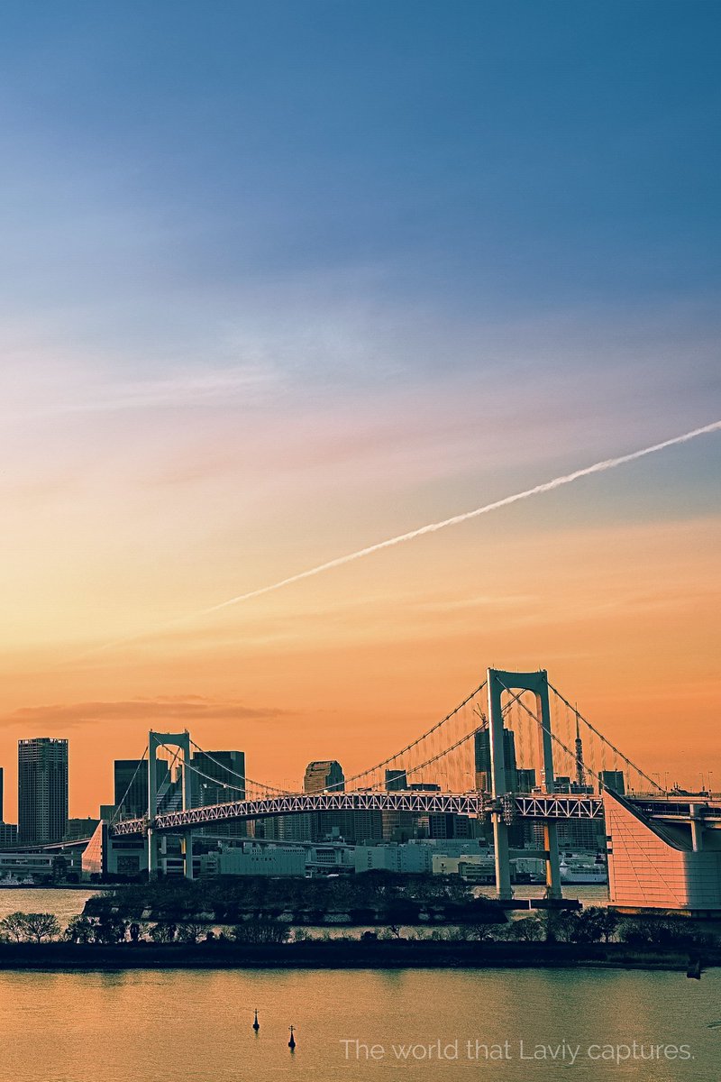 宵と夕を隔てる飛行機雲。