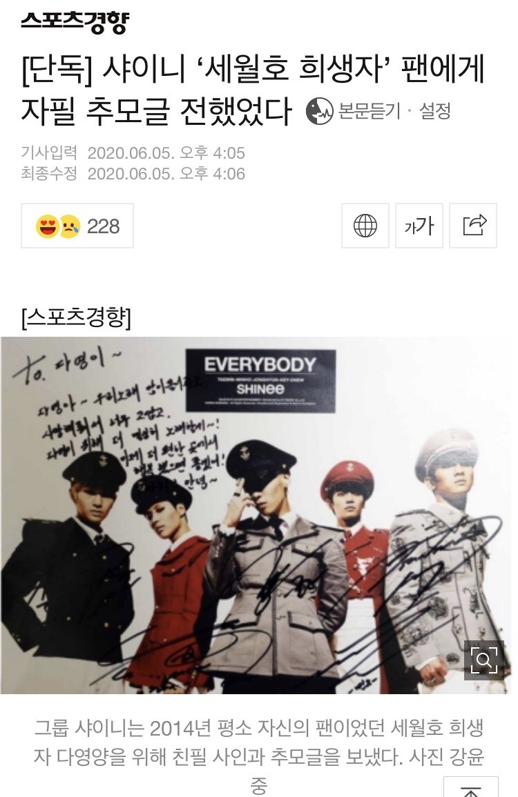 グループSHINeeが自身のファンだったセウォル号の犠牲者に追悼文を送った件が6年ぶりに知らされた。