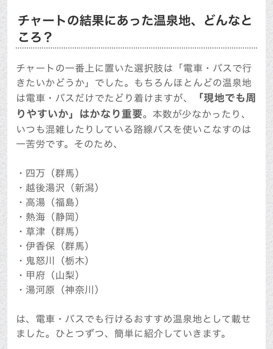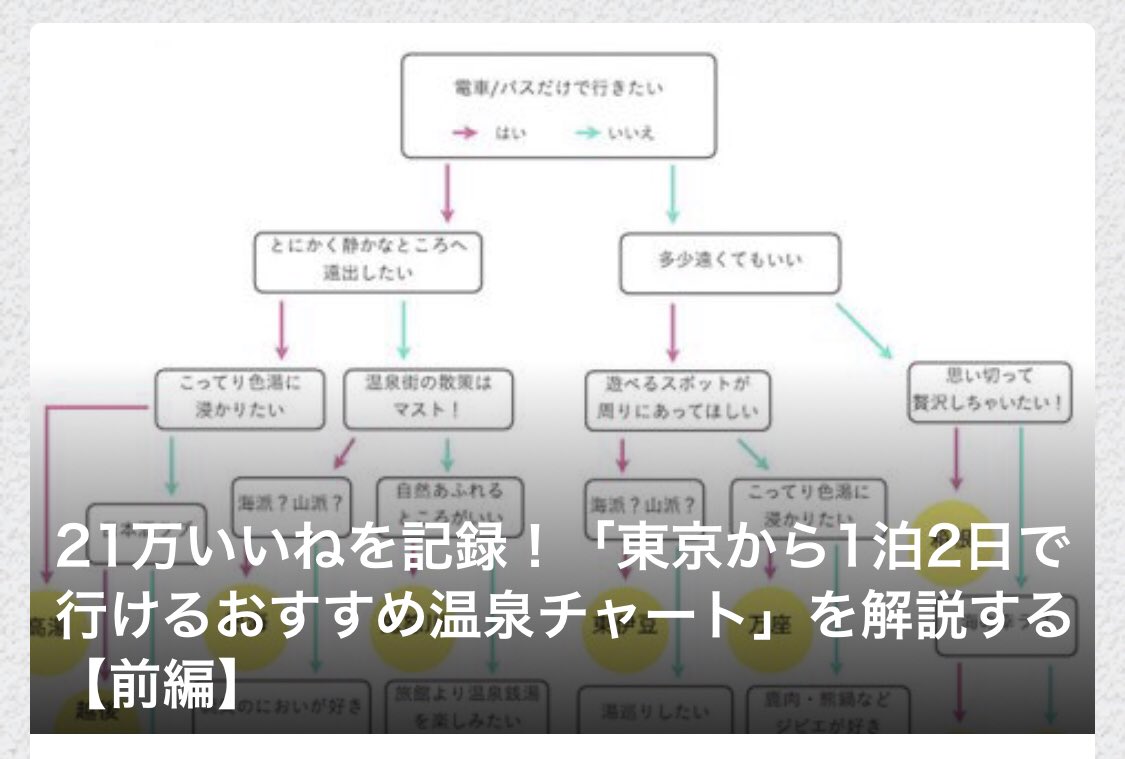 書きました〜〜!21万いいねを記録した温泉チャートの解説記事です。車運転しない人におすすめの温泉地を紹介しています🥳