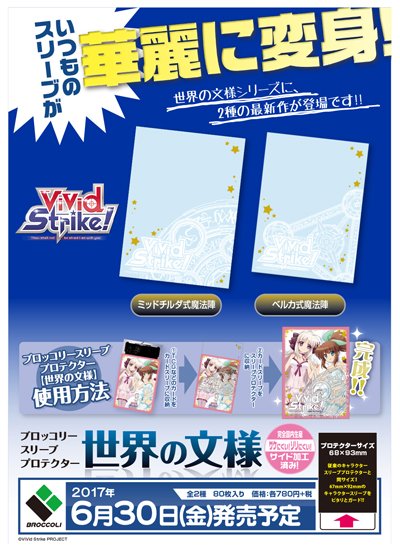 まずはこちら!ブロッコリースリーブプロテクター【世界の文様】シリーズに、アニメ「ViVid Strike!」から「ミッドチルダ式魔法陣」と「ベルカ式魔法陣」の2種類が登場です!先日お知らせしたキャラクタースリーブと一緒にゲットして下さいね!6月30日(金)発売です!#ブロサプライ