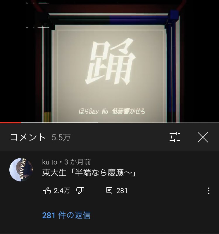 YouTubeで見かけた面白いコメントや名言、迷シーンなどをツイートします。ネタ提供・RT依頼・企業案件はお気軽にDMまで。過去にバズったツイートはいいね欄/ブログ/YouTubeチャンネルで。