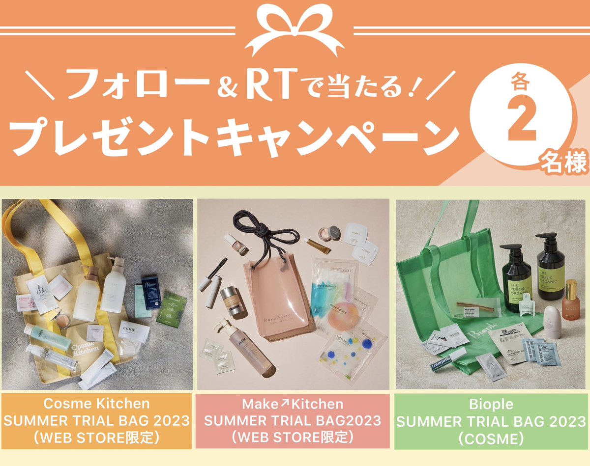 「Cosme Kitchen・Make↗Kitchen・BiopleのSUMMER TRIAL BAG 2023」を各2名様にプレゼント🎁