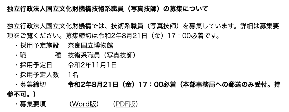 現在、奈良国立博物館では新たに写真技師を募集しているようです。