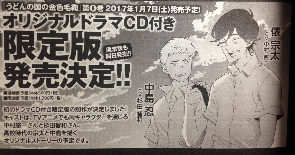 『うどんの国の金色毛鞠』第9巻ドラマCD付き限定版予約は本日(11月15日)迄です!!できれば…予約して下さると本当にありがたいです…!個人的には中村さん杉田さんのアフタートークにかなりニヤニヤしました。よろしくお願い致します。