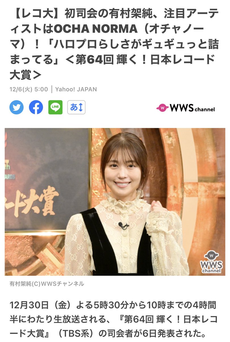 つばきの時のスピーチで涙ぐんじゃう安住アナとレコ大で1番気になるグループはOCHA NORMAな有村架純の2人が司会なの本当に楽しみ