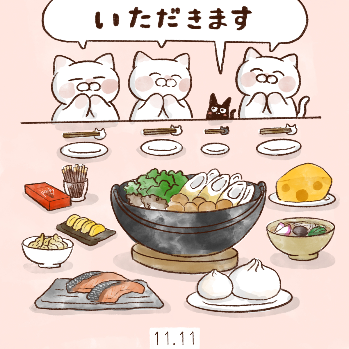 11月11日 📍いただきますの日 📍箸の日 📍チーズの日 📍豚まんの日 📍麺の日 📍ポッキー&プリッツの日 📍きりたんぽの日 📍鮭の日 📍ピーナッツの日 📍たくあんの日 みんなで一緒に🙏