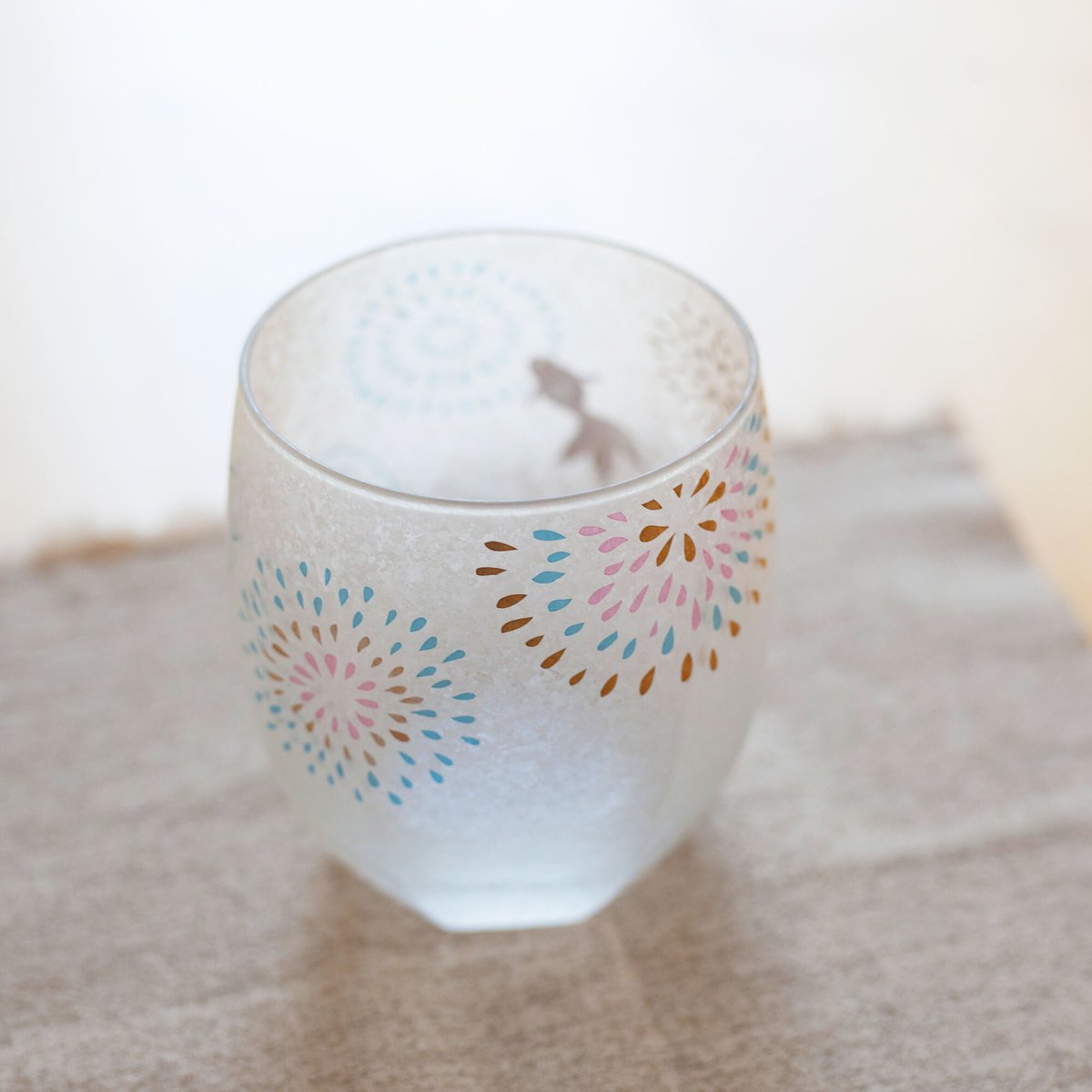 【夏の食卓にあるとちょっと嬉しい、花火と金魚が描かれたグラス】