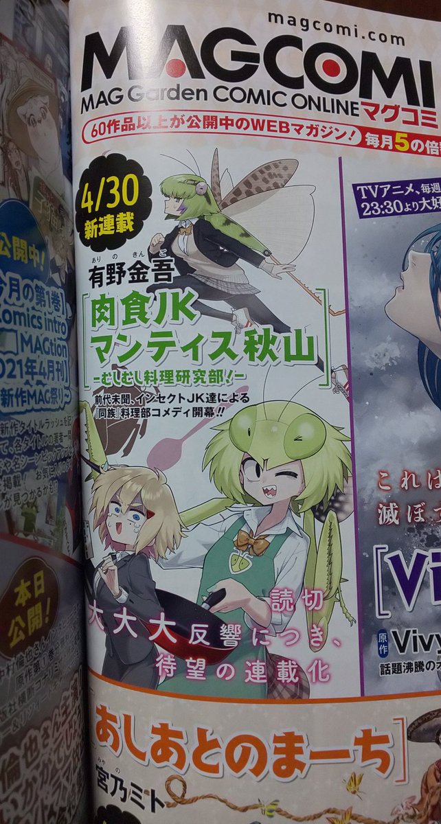 【新連載】『肉食JKマンティス秋山 〜むしむし料理研究部!〜』有野金吾 4月30日連載開始! - MAGCOMI magcomi.com/article/entry/…