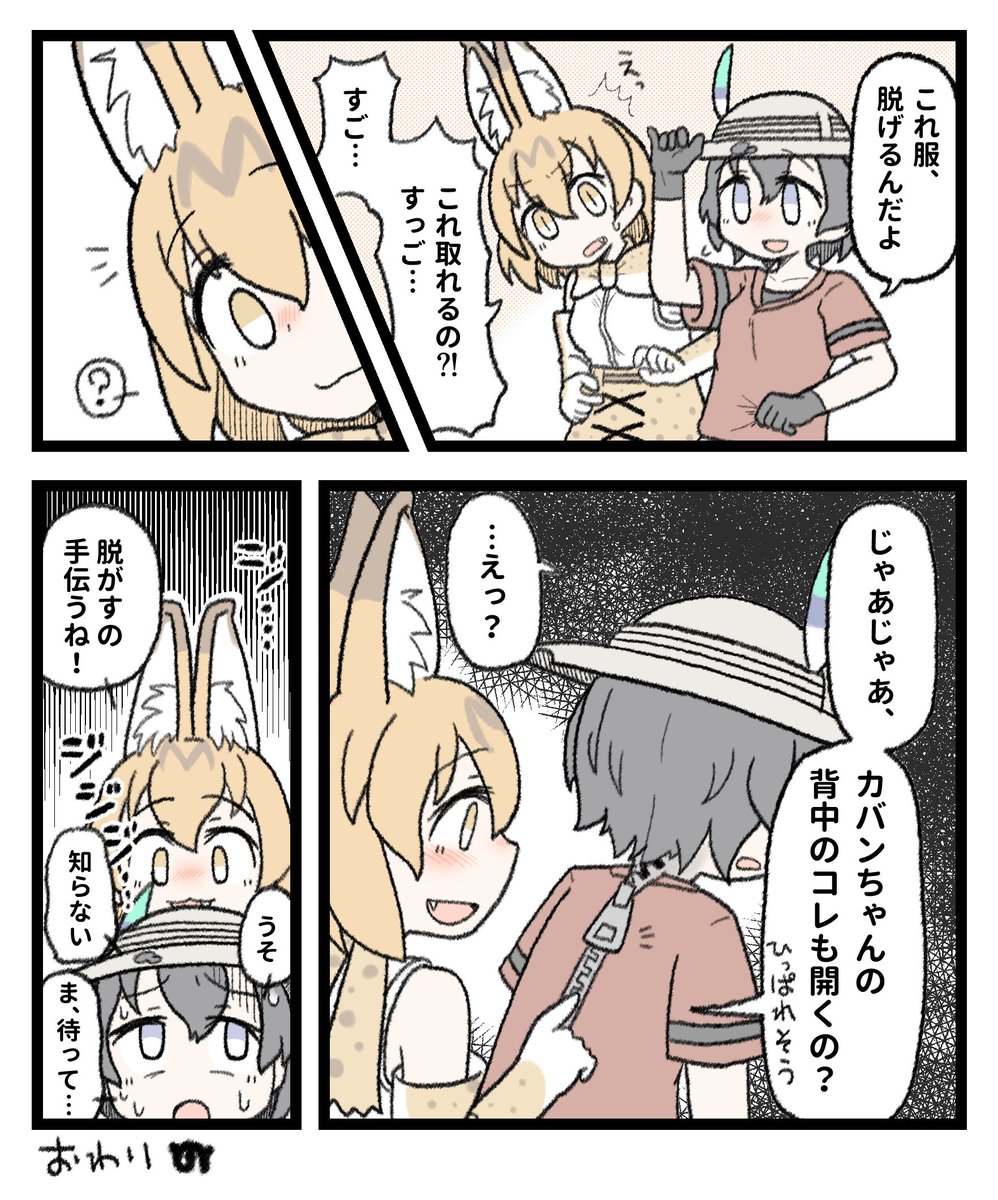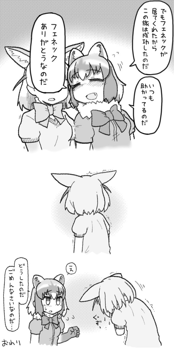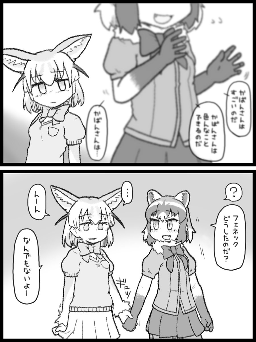 アライさんが食べられて元のアライグマに戻り、慌てて駆け寄るけどアライさんは記憶がリセットされてるから怯えて逃げたり噛み付いたりし、それでも必死で抱きしめて暴れるアライさんに「何も怖く無いからねー…このフェネックさんにおまかせだよー…」と語りかけるフェネックさん