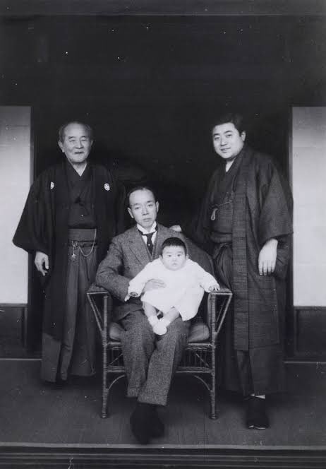 渋沢栄一(左上)、息子の渋沢篤二(中央)、孫の渋沢敬三(右上)、ひ孫の渋沢雅英さん(篤二さんの膝上)