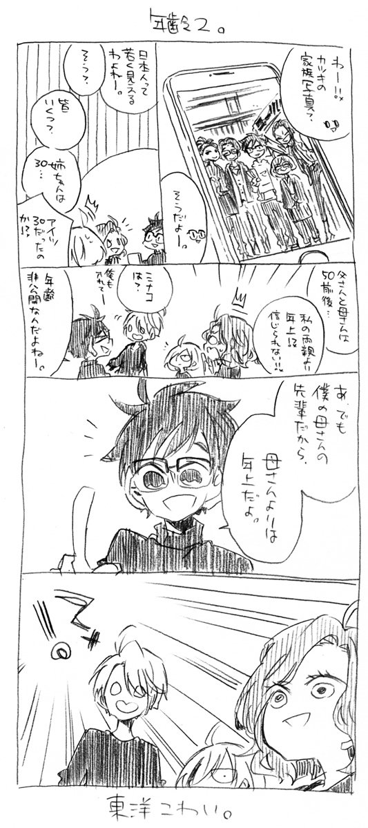 SNS無精のかつきくん② ヴィク勇前提落描き。皆かつきのスマホ使い過ぎ。