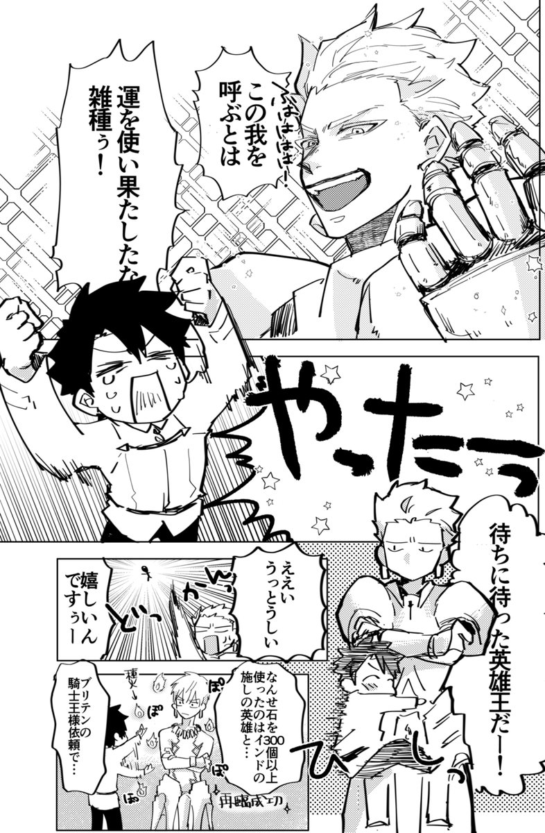 既に騎士王召喚済みのマスターが念願の英雄王を召喚した時の漫画です。