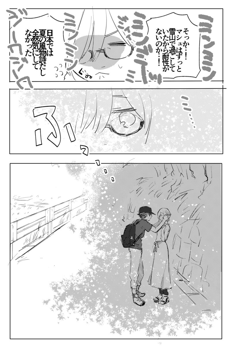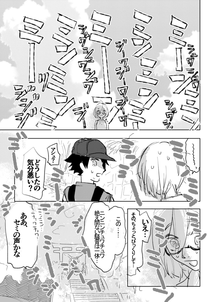 セミの鳴き声に耐性がなくてぐぬうってなるマシュの漫画です。ぐだマシュです。 ※なんかもう色々全部平和に片付いてぐだおのばあちゃんちとかに泊まりに行く幸せな世界線です。 ※細かい事は気にしないで。