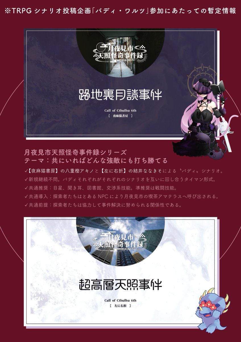 アキノさん @aki01_TRPG と〝バディ〟シナリオで参加予定です! 詳細は添付画像をご覧ください。