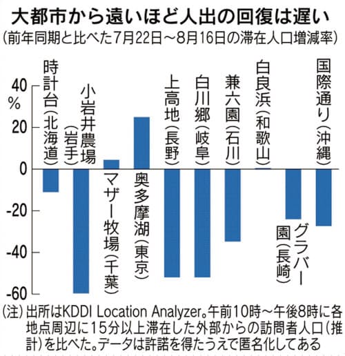 観光客の戻りは大都市から距離が離れるほど遅いことがわかりました。「Go To トラベル」が始まった7月22日から8月16日の平均滞在人口は、長野県の上高地や岐阜県の白川郷で前年の同じ時期から半減しています。