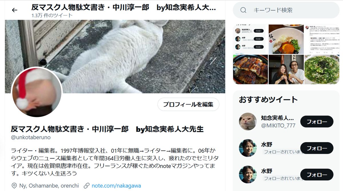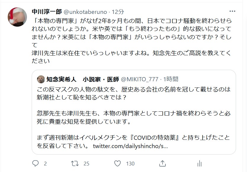 もう、本当にこの2年以上糞だった。「マスクは意味がねぇ」と言ったらYahoo!への配信もできないし、「中川さんが狂った」と仕事干されるし。でもさ、結局2年8ヶ月の感染対策の徹底とやらはなーんも効果なかっただろ? そして挙句の果てには知念実希人氏らから誹謗中傷される状況に。なんじゃこの国? twitter.com/unkotaberuno/s…