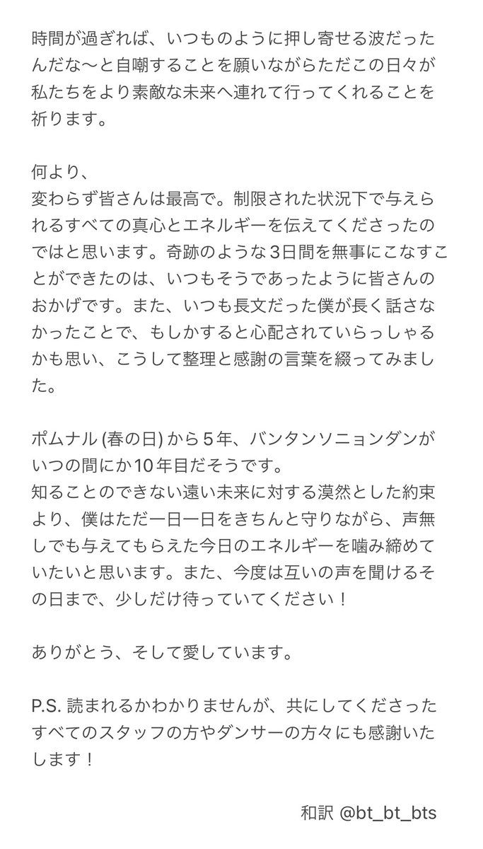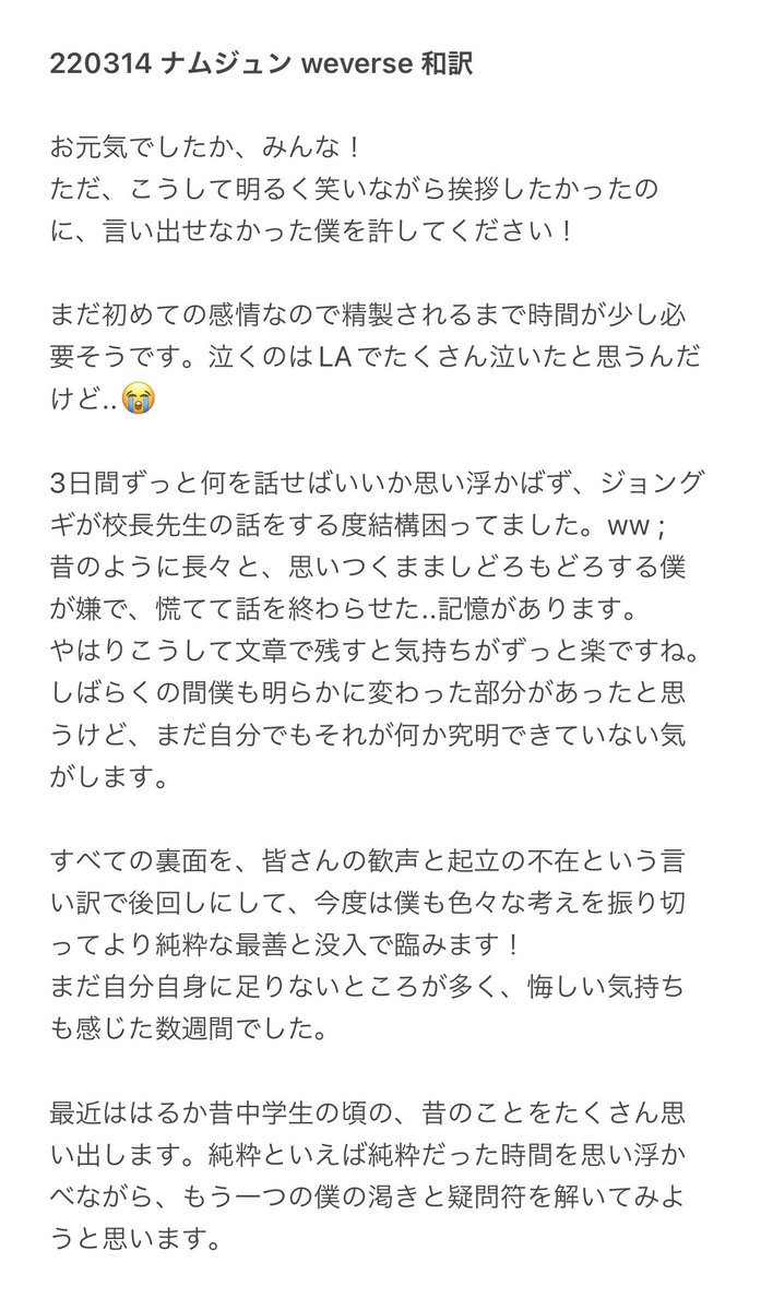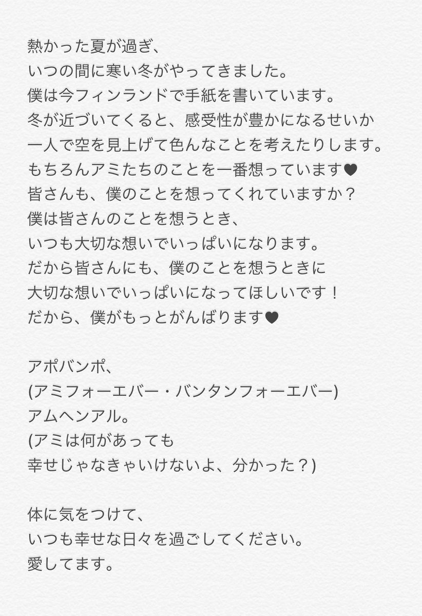 昨日バンタン会食見てじーんときたし、アミの心配していたけど、むしろ元気付けて下さってて安心したと。朝起きたら'BTSの活動休止、解散'などと騒がれていたので訂正したかった。