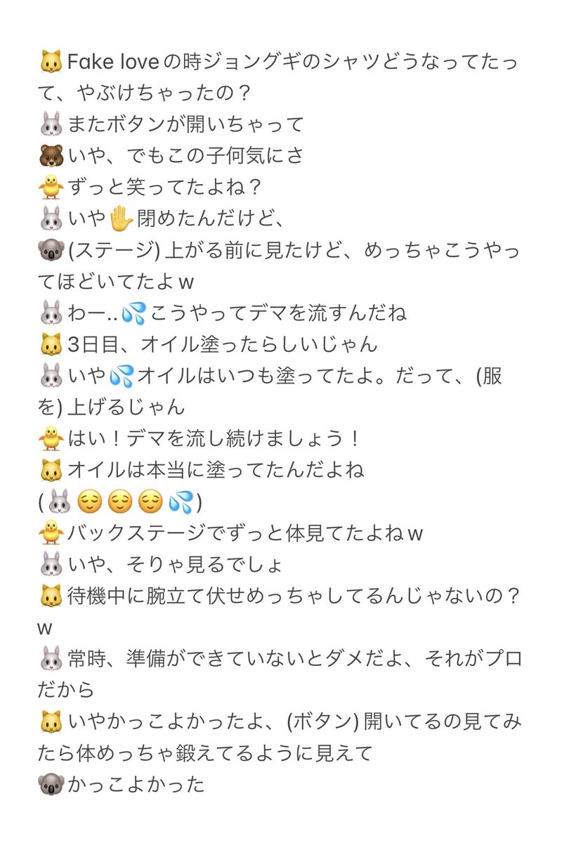 ソウルコンのボタンの話!パフォーマンスの一環で腹筋を見せる振付があるから事前にオイルを塗ったりそういうところもちゃんと考えてるんだなと知ったし、「🐰常時、準備ができていないとダメだよ、それがプロだから」って真剣に言ってたのさすがだし素敵