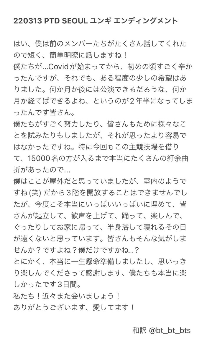 ミュベンサノクのグクのエンディングメントめちゃくちゃ愛おしいな。気持ちを上手く言葉にできないと言うけどいつも十分伝わってるしSo show me~I'll show youのやり取り、Tear発売時のサノクやサイン会等からその後もやるようになったけど「🐰すぐできるよね、ウリアミ達」と言う信頼がまた愛おしい twitter.com/peachcrush_jk/…