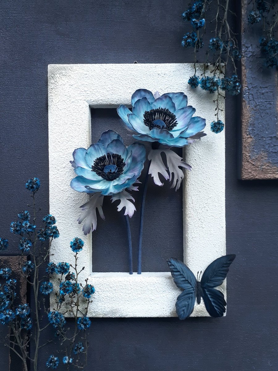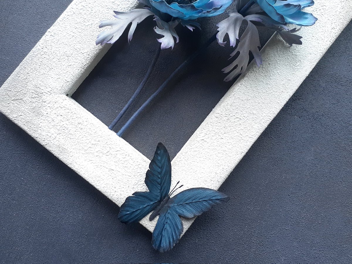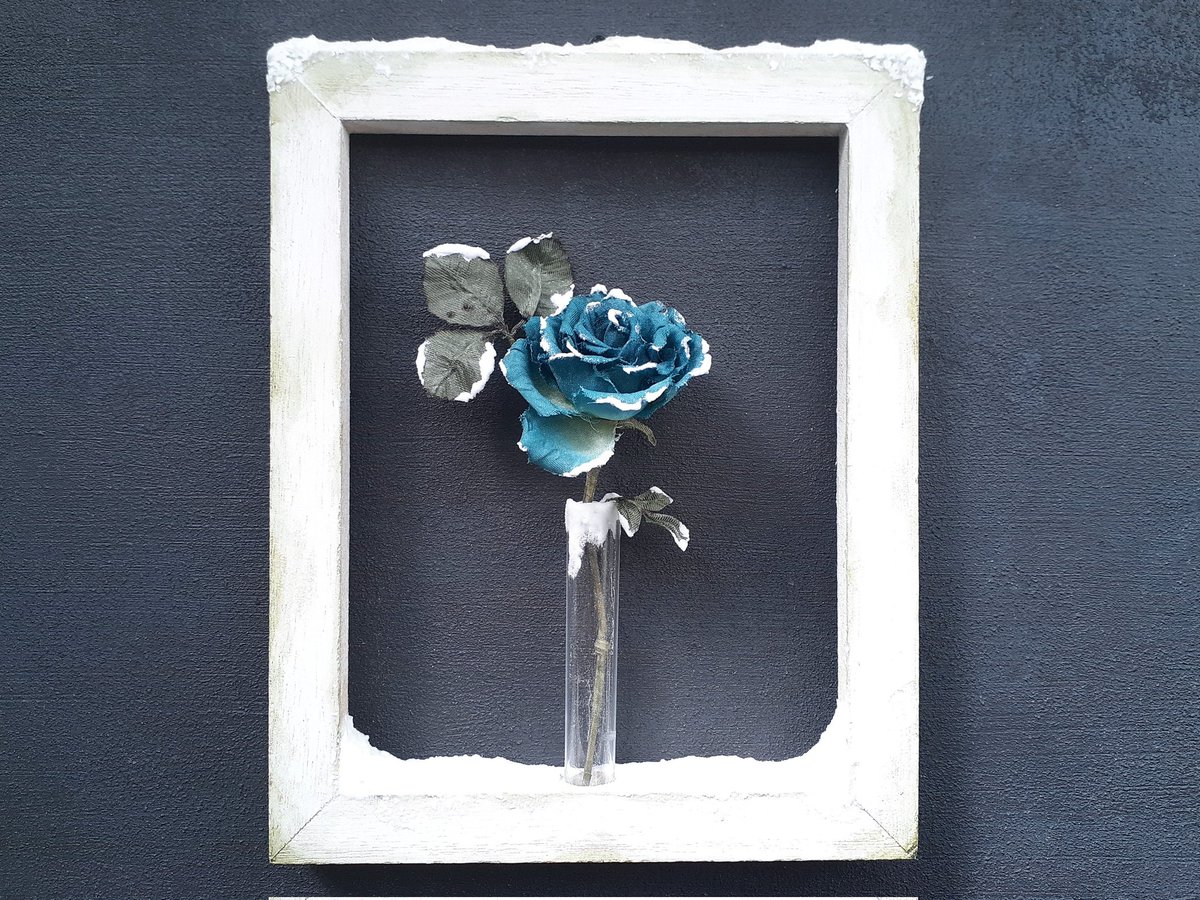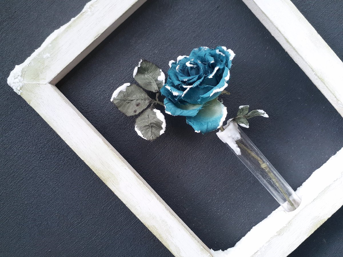 100円ショップの可愛い壁掛けを使い雪の表現の試作をしたので、手染めの青薔薇を飾り抽選で1名様にお贈りします。