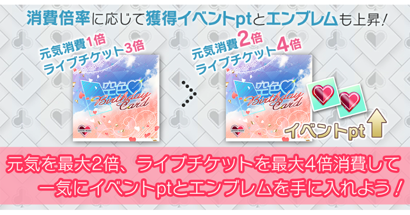 楽曲をプレイする際に元気を最大2倍、ライブチケットを最大4倍消費することで、一度に大量のイベントptとエンブレムを獲得できますよ!