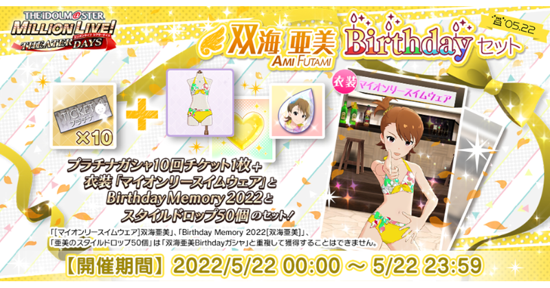誕生日を記念して、「プラチナガシャ10回チケット」に衣装「マイオンリースイムウェア」「Birthday Memory 2022」「スタイルドロップ50個」が付いてきますよ♪