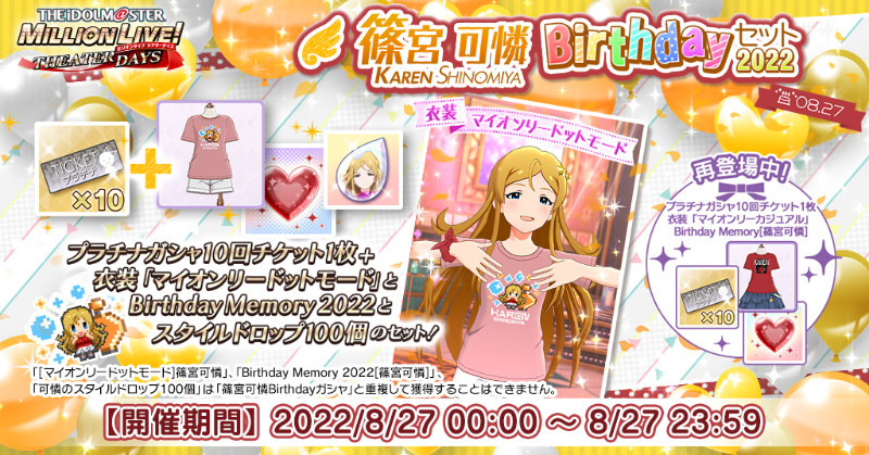 誕生日を記念して、「プラチナガシャ10回チケット」に衣装「マイオンリードットモード」「Birthday Memory 2022」「スタイルドロップ100個」が付いてきますよ♪