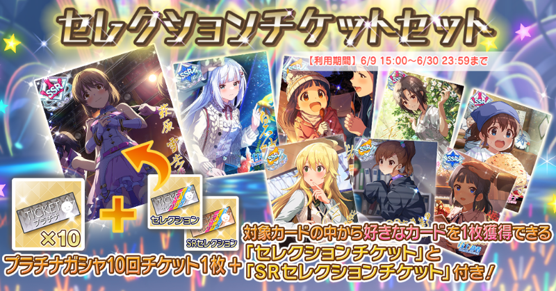 『セレクションチケットセット』登場です!有償ミリオンジュエル2500個で「プラチナガシャ10回チケット」1枚に、対象の中から好きなカードを1枚選んで獲得できる「セレクションチケット」と「SRセレクションチケット」付き!詳しくはアプリ内のお知らせをご確認ください♪