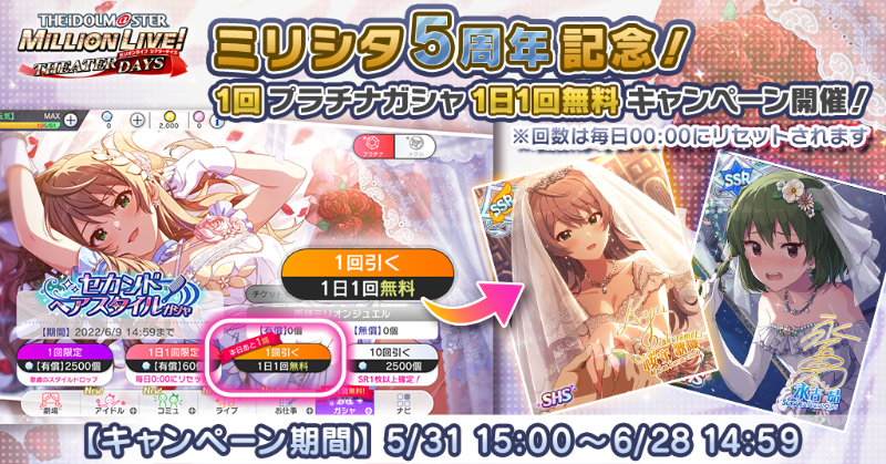 『ミリシタ5周年記念!1回プラチナガシャ1日1回無料キャンペーン!』を開催中です!
