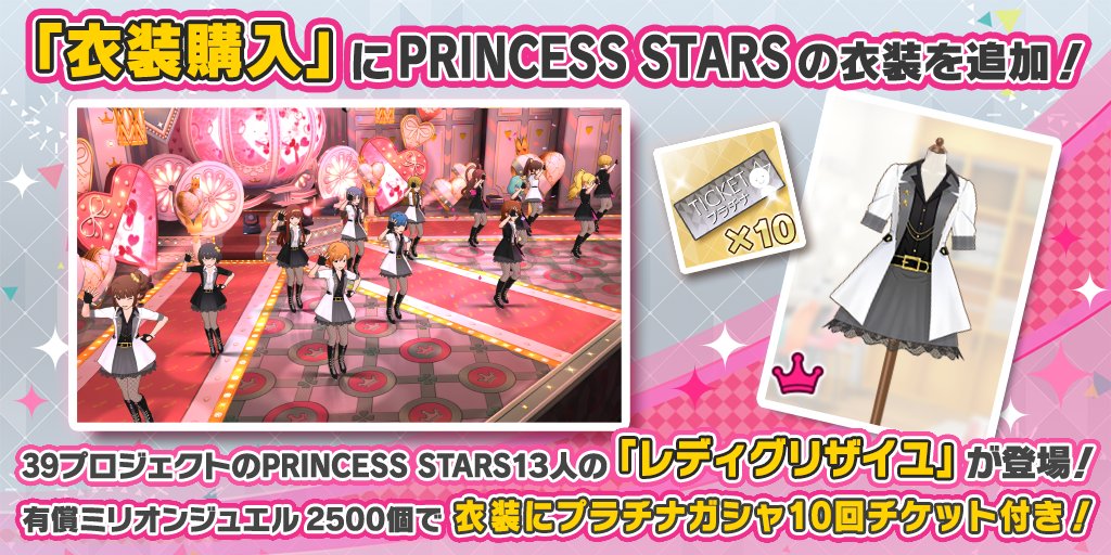 PRINCESS STARS 13人分の衣装が付いたプラチナガシャ10回チケットを、有償ミリオンジュエル2500個で購入いただけます!