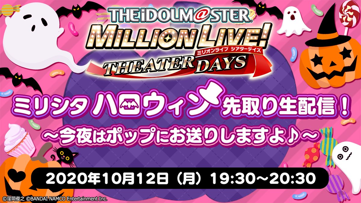【本日19時半から!】「ミリシタ ハロウィン先取り生配信! ~今夜はポップにお送りしますよ♪~ 」は、豪華声優を迎え、盛りだくさんでお届けします♪ お楽しみに♪ #ミリシタ