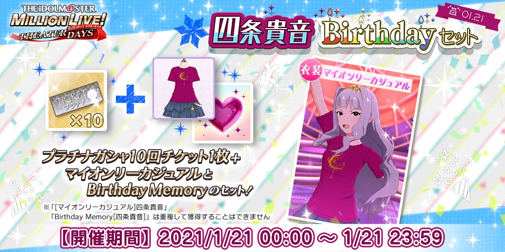 誕生日を記念して、「プラチナガシャ10回チケット」に「マイオンリーカジュアル」と「Birthday Memory」の2つが付いてきますよ♪誕生日だけの特別なセットです♪