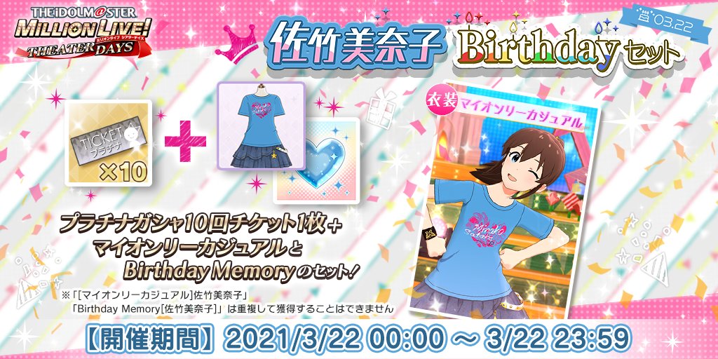 誕生日を記念して、「プラチナガシャ10回チケット」に「マイオンリーカジュアル」と「Birthday Memory」の2つが付いてきますよ♪誕生日だけの特別なセットです♪