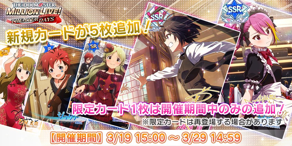 1回目は1500個、2回目は2000個、3回目は2500個の有償ミリオンジュエルで引くことができ、さらに3回目はピックアップカードが1枚以上確定!