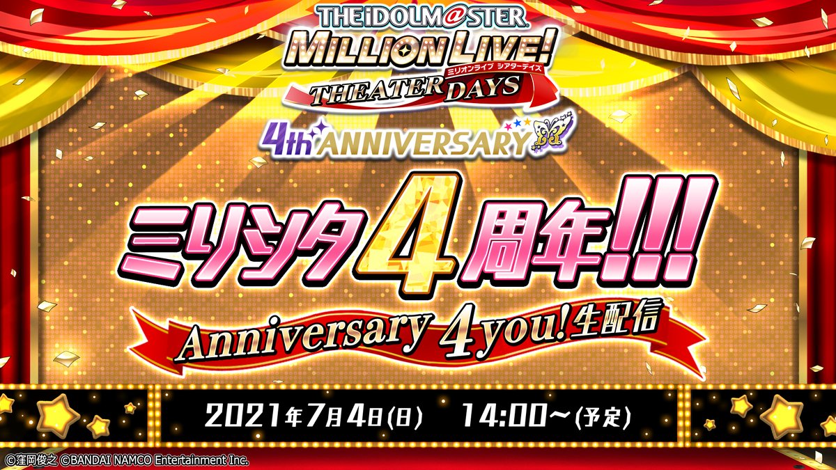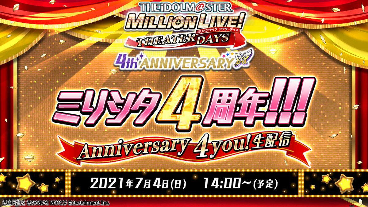 【本日14時から!】「ミリシタ4周年!!! Anniversary4you! 生配信」は、豪華声優陣を迎え、ゲーム情報や様々な企画など盛りだくさんでお届けします♪ お楽しみに♪ #ミリシタ