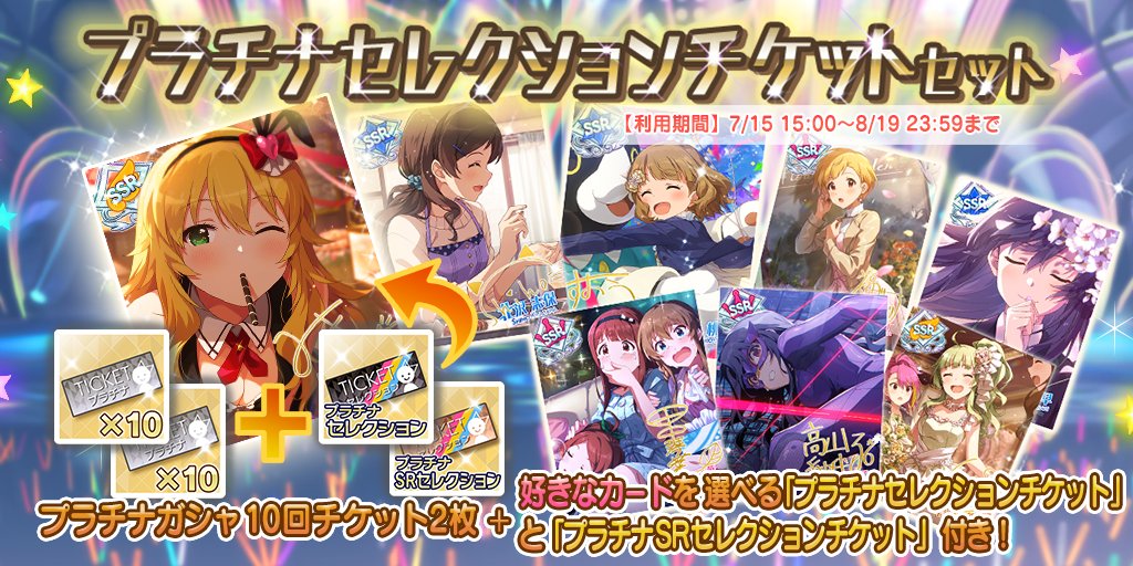 『プラチナセレクションチケットセット』登場です!有償ミリオンジュエル5000個でセットと交換すると、なんと!「プラチナガシャ10回チケット」2枚に、好きなカードを選べる「プラチナセレクションチケット」と「プラチナSRセレクションチケット」が付いてきますよ♪