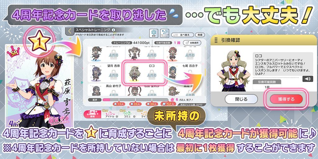 取り逃してしまった4周年記念カードはいずれかの4周年記念カードを☆1に育成するごとに、獲得することができますよ♪