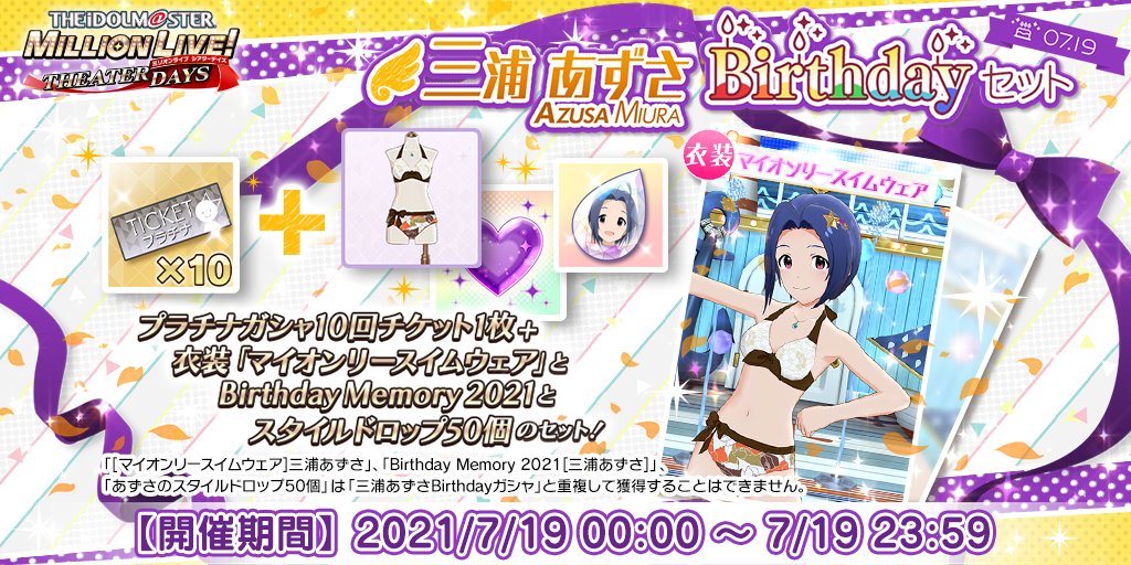 誕生日を記念して、「プラチナガシャ10回チケット」に衣装「マイオンリースイムウェア」「Birthday Memory 2021」「スタイルドロップ50個」が付いてきますよ♪
