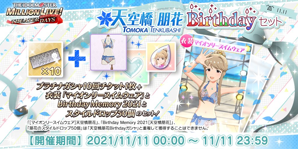 誕生日を記念して、「プラチナガシャ10回チケット」に衣装「マイオンリースイムウェア」「Birthday Memory 2021」「スタイルドロップ50個」が付いてきますよ♪