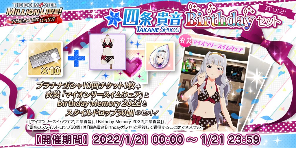 誕生日を記念して、「プラチナガシャ10回チケット」に衣装「マイオンリースイムウェア」「Birthday Memory 2022」「スタイルドロップ50個」が付いてきますよ♪