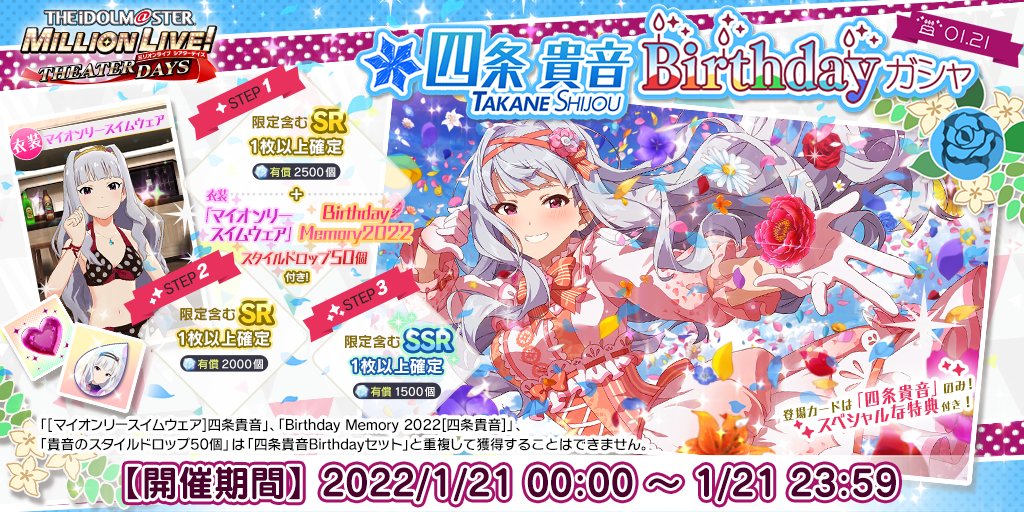 誕生日を記念して、「プラチナガシャ10回チケット」に衣装「マイオンリースイムウェア」「Birthday Memory 2022」「スタイルドロップ50個」が付いてきますよ♪