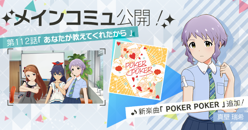 第112話をプレイすると、真壁瑞希ちゃんが歌唱する楽曲『POKER POKER』をライブで選択できるようになりますよ♪