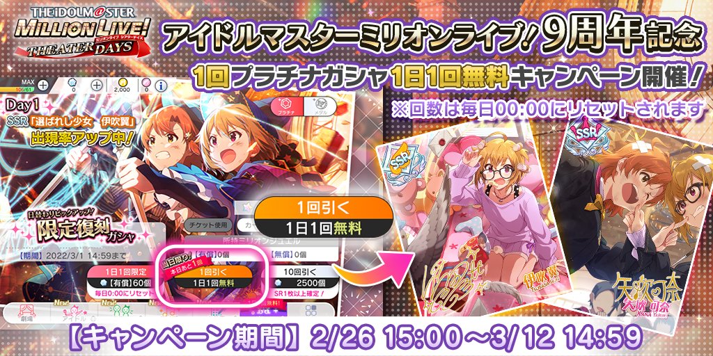 「アイドルマスター ミリオンライブ!」の9周年を記念して、『1回プラチナガシャ1日1回無料キャンペーン』を開催中です!