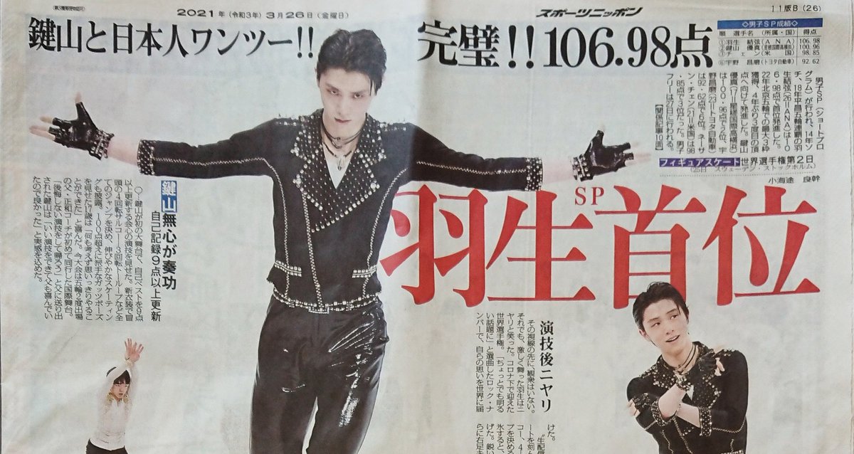 27日付紙面。フィギュアスケート世界選手権第2日(25日、ストックホルム)、男子SPで #羽生結弦 は106.98点をマークし、首位発進です。華麗な舞いでした。