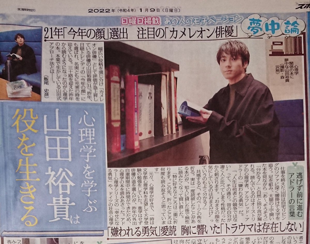 日曜掲載「あの人のモチベーション 夢中論」は俳優の #山田裕貴(31)が登場。昨年、日経トレンディの「今年の顔」にも選ばれ、名実ともに充実の時。心理学の書物に興味を見せています。