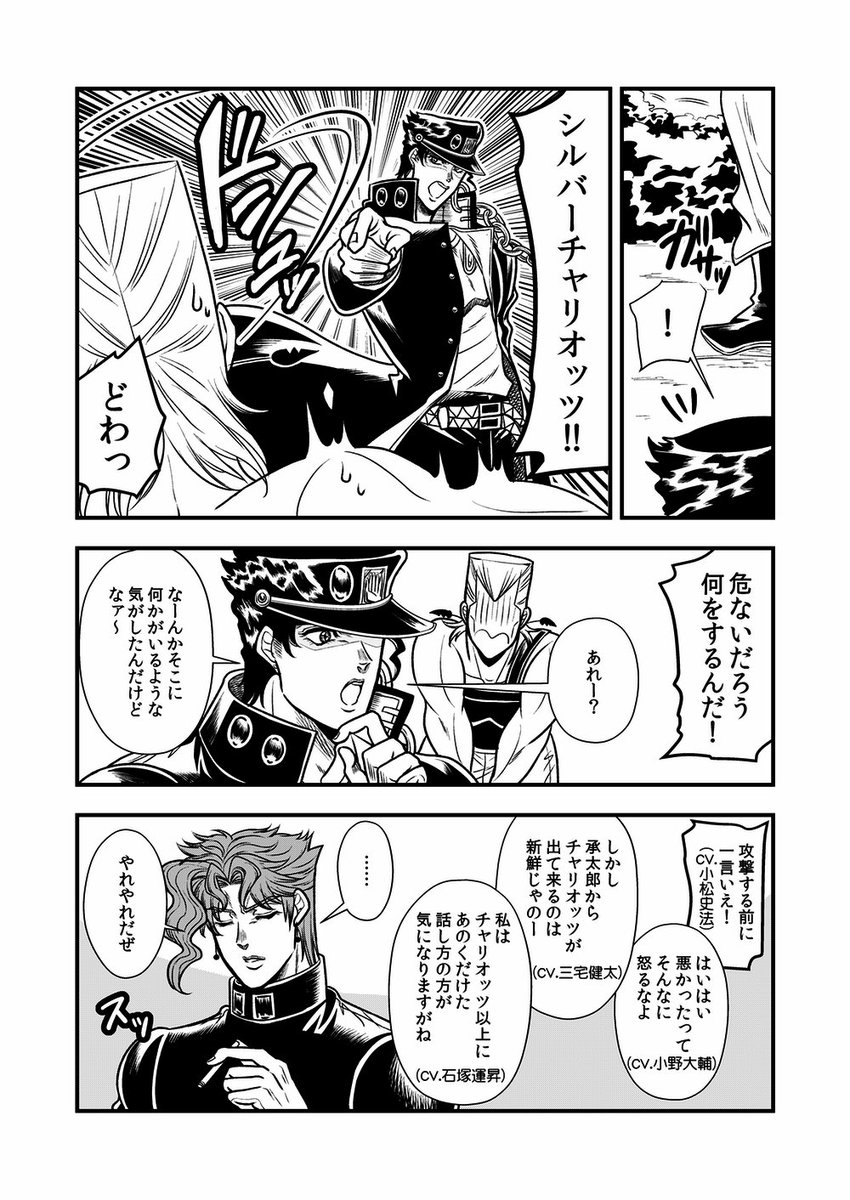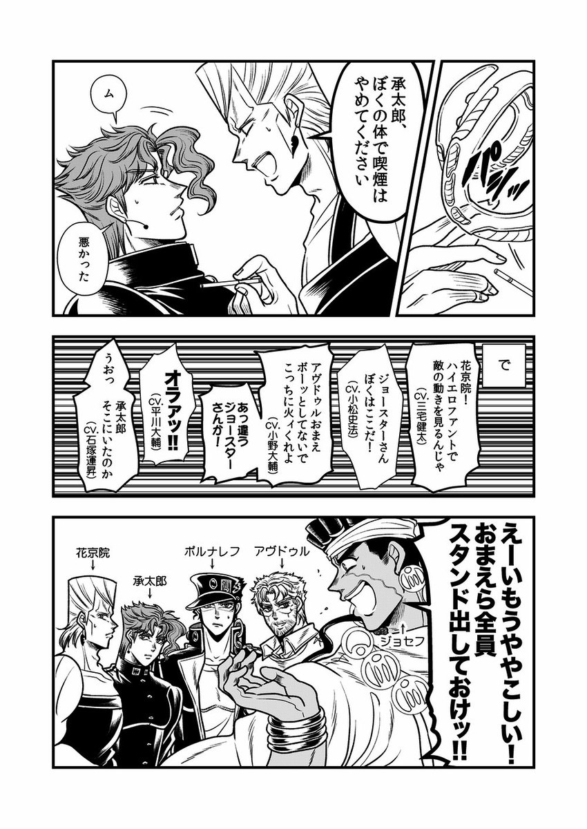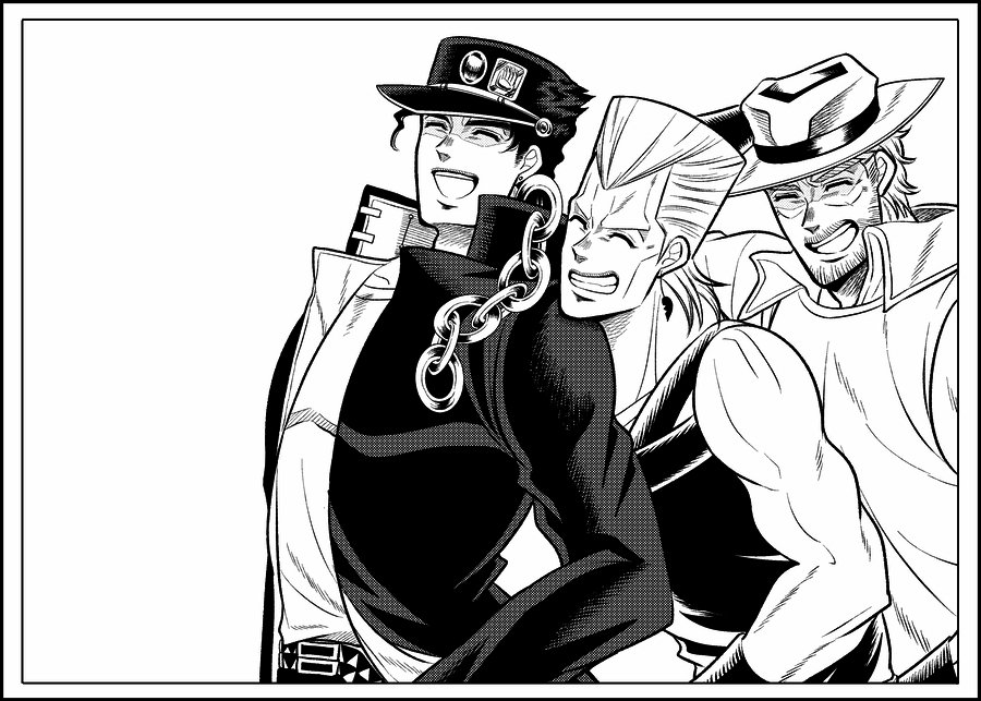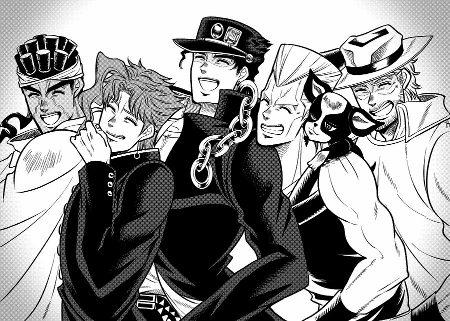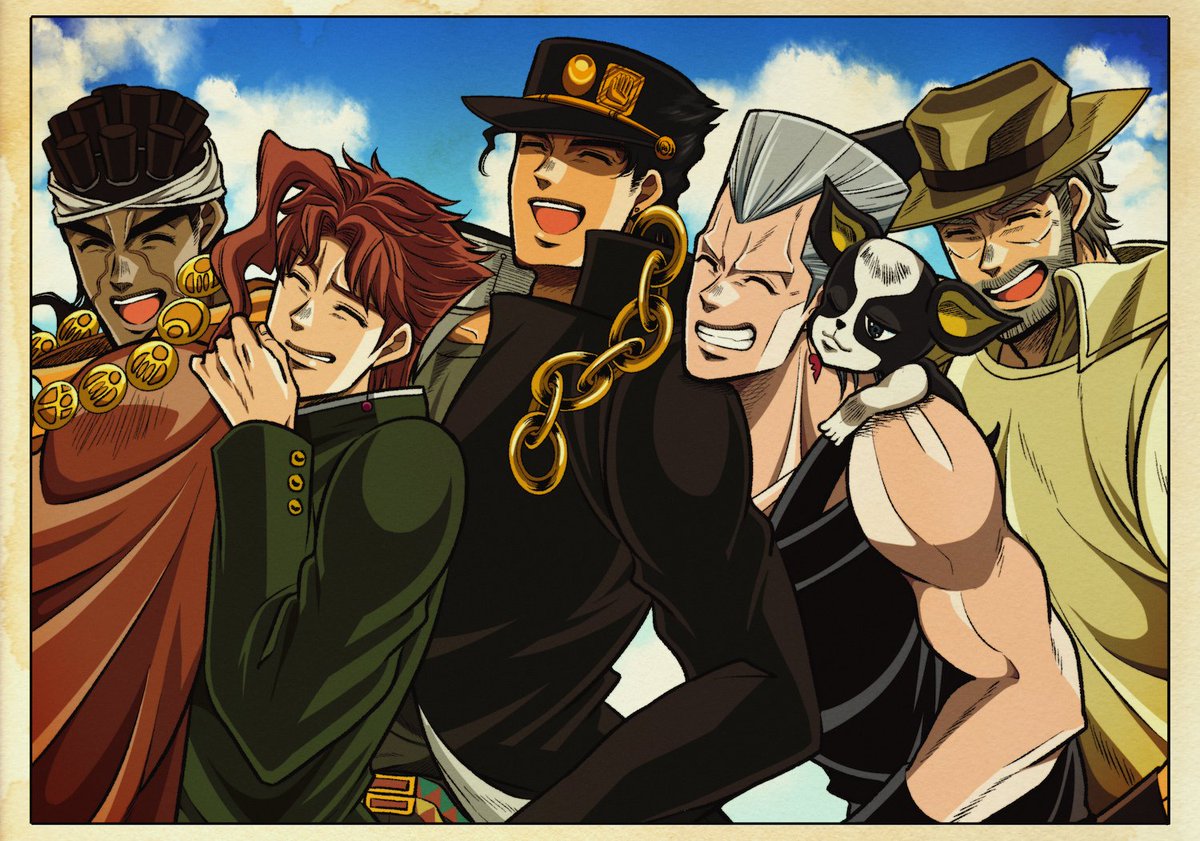 「なぁジョースターさん、コレ全員入ってんのかぁ?」 「私は見切れているような気がしますが」 「大丈夫じゃって!もっと詰めればイケるイケる!」 「おい承太郎押さないでくれ、苦しい」 「無茶言うんじゃねーよ」 「フン!」 「いいかぁおまえら、撮るぞ〜!」 (スタクル)