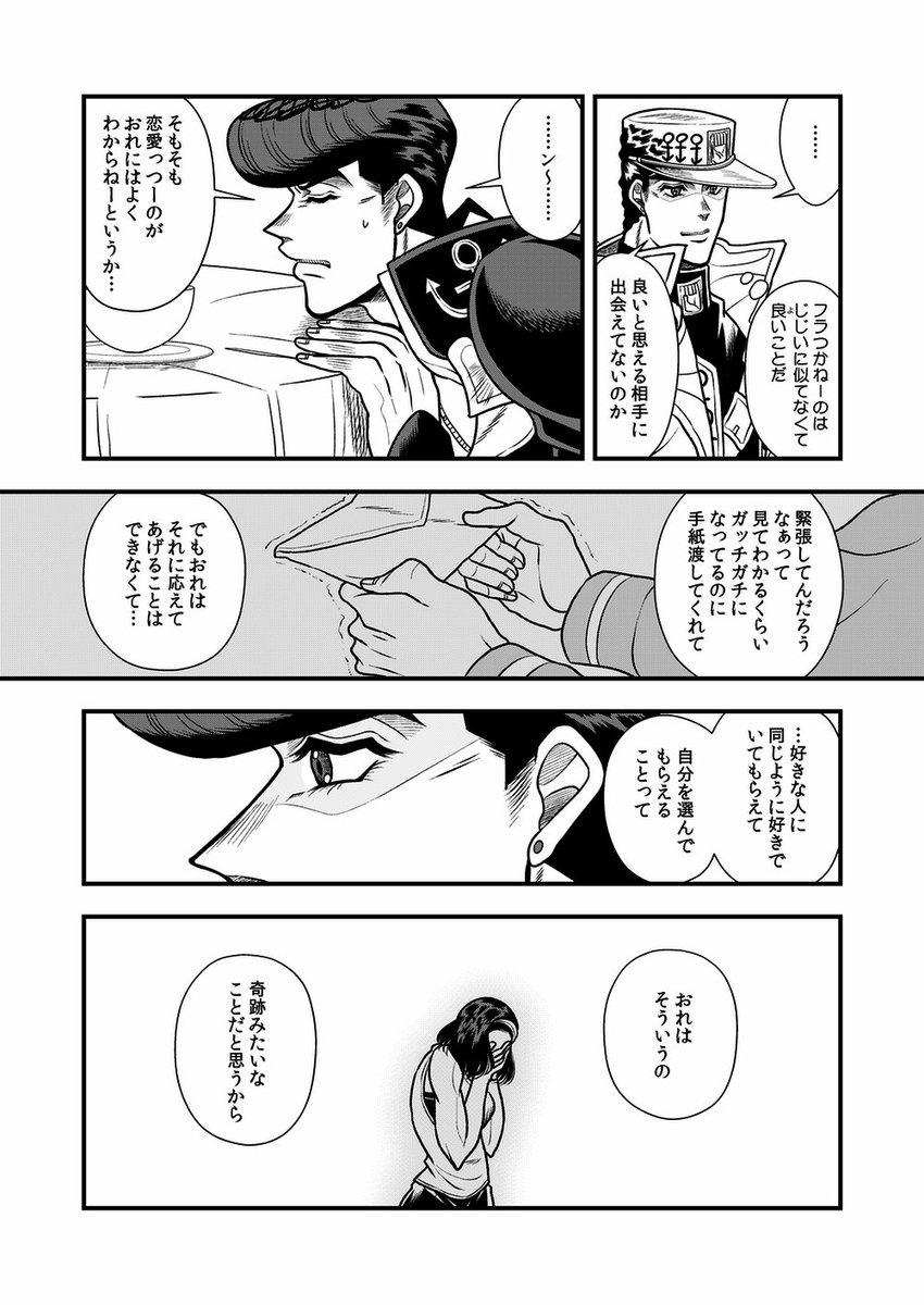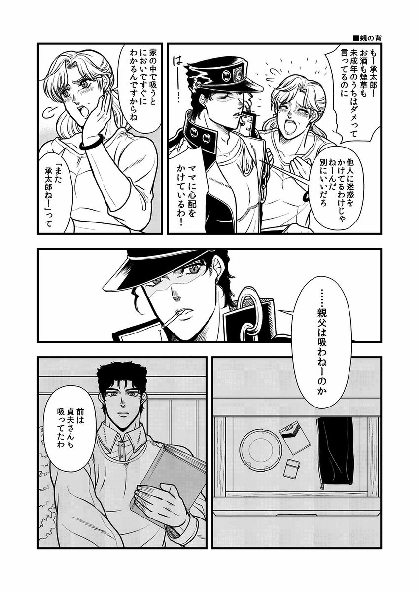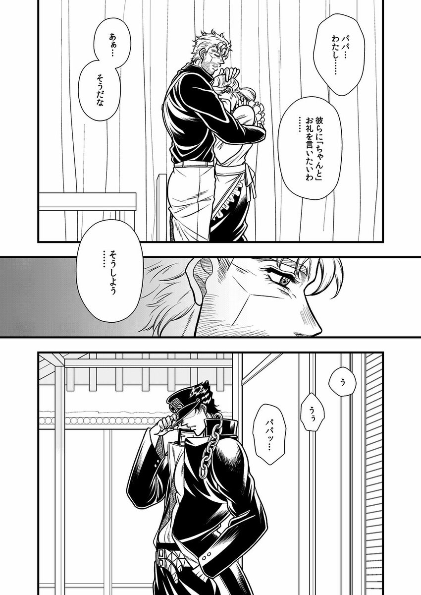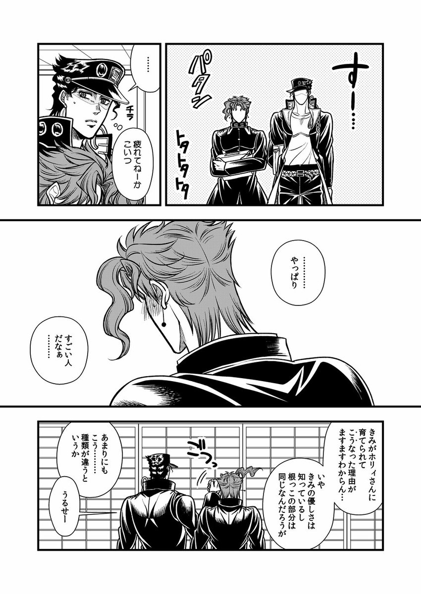 こんな日が来る未来もあったのかも知れない 同じスタンド使いだからという理由もあるんだろうけど、あの花京院に「恋をするなら〜…」とまで言わせたホリィさんはすごい あと花京院は承太郎がグレる前を知らないはずだから何となく「そんなバカな…」みたいに思ってて欲しい