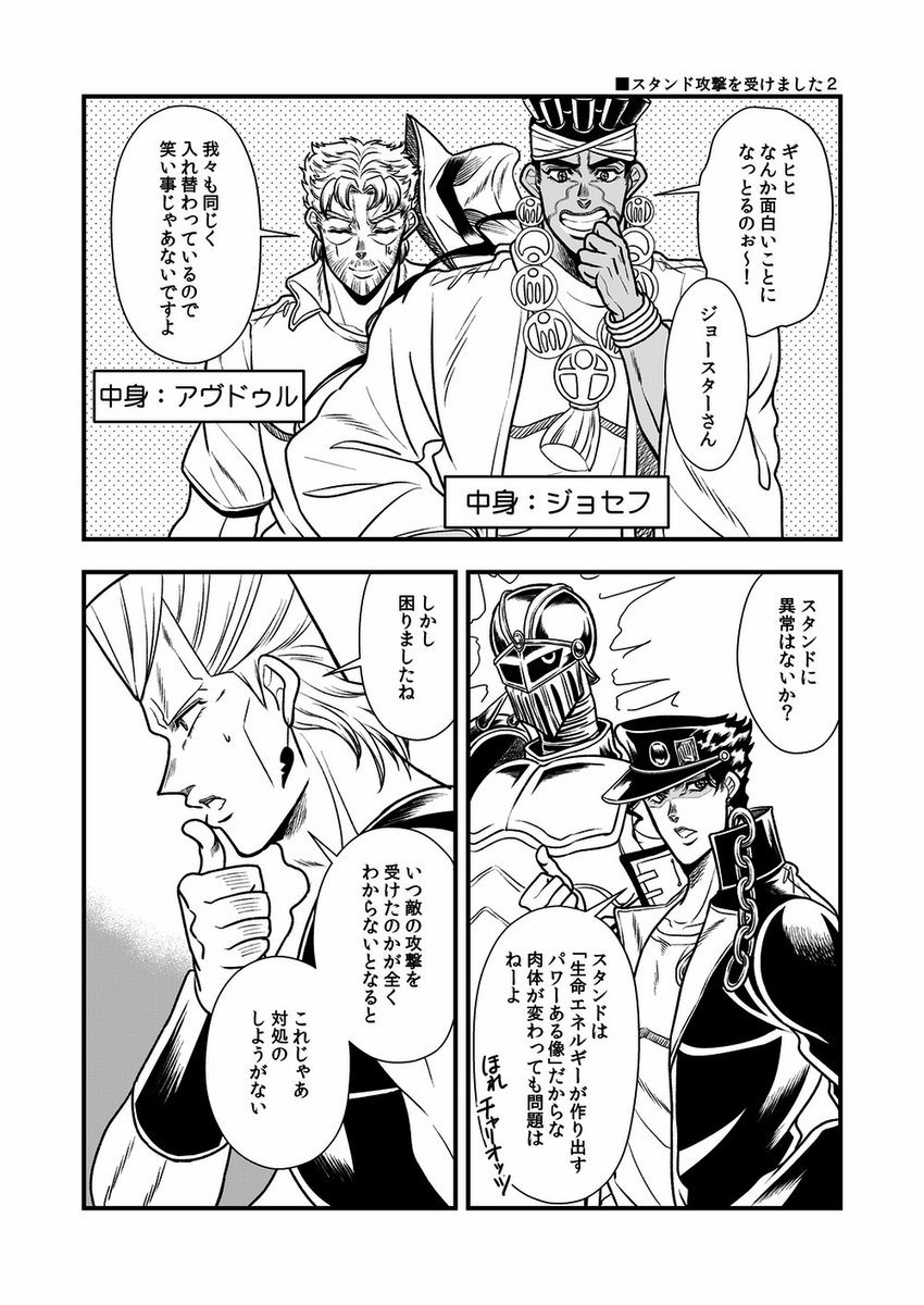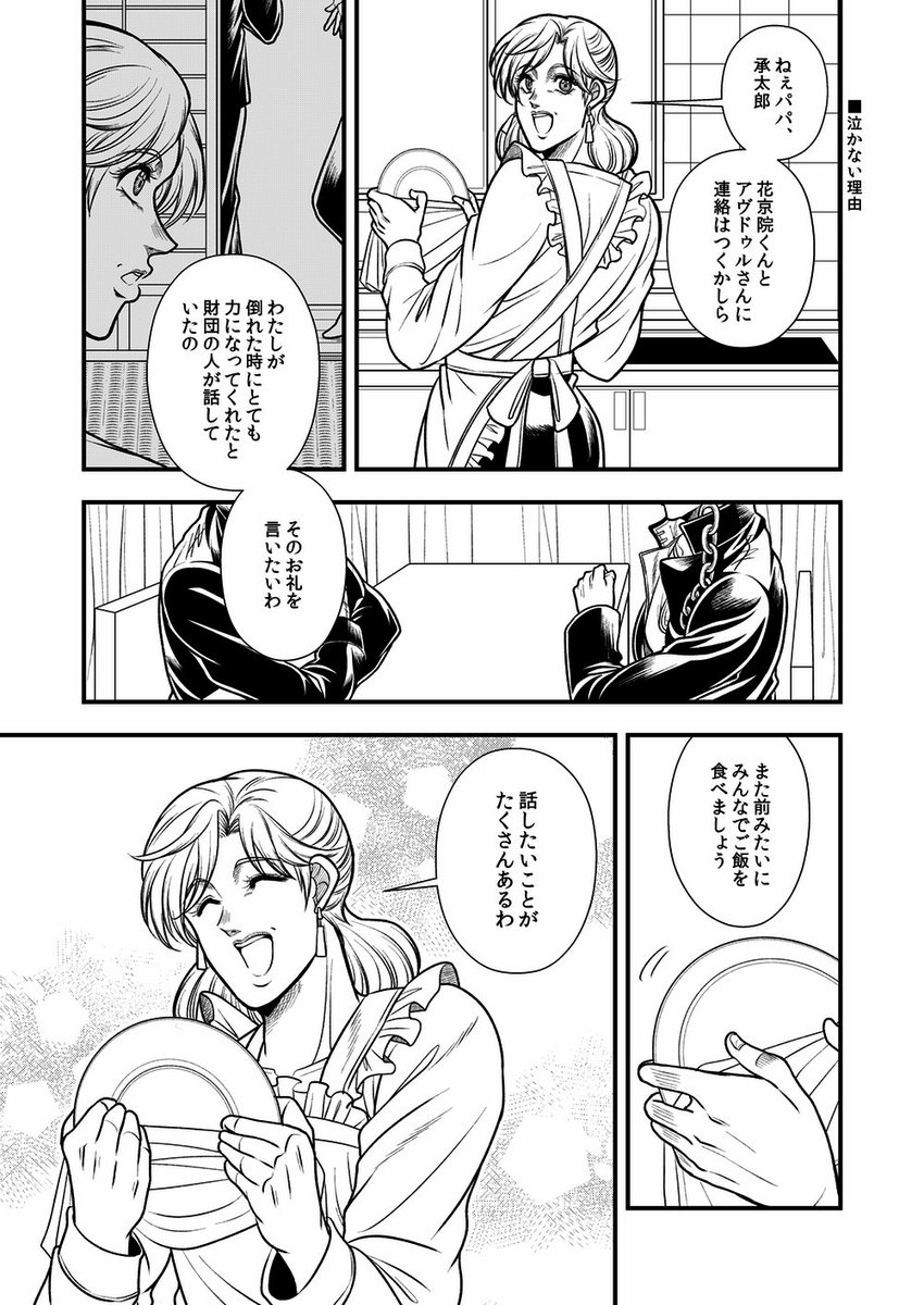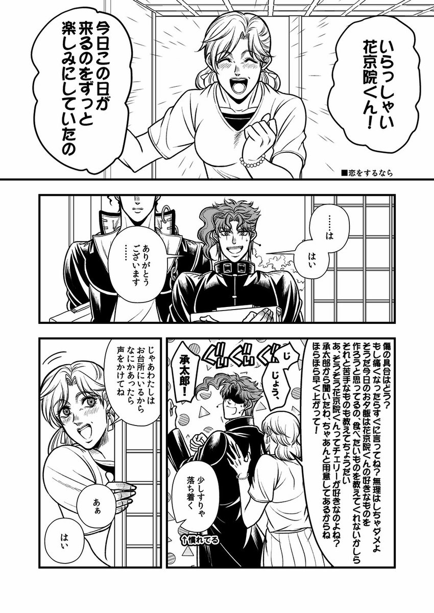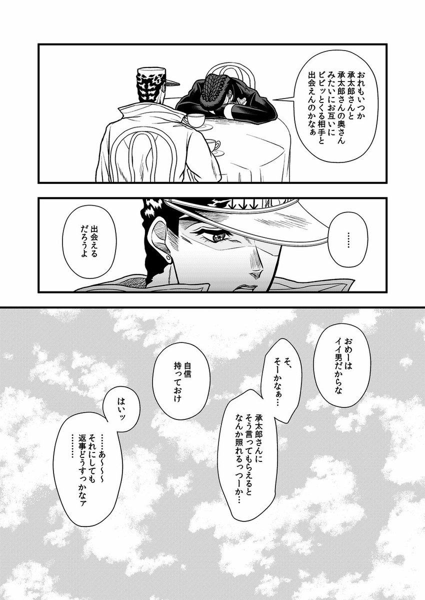 こんな日が来る未来もあったのかも知れない 同じスタンド使いだからという理由もあるんだろうけど、あの花京院に「恋をするなら〜…」とまで言わせたホリィさんはすごい あと花京院は承太郎がグレる前を知らないはずだから何となく「そんなバカな…」みたいに思ってて欲しい