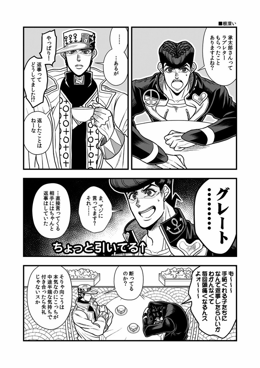 仗助くんと承太郎の歌い方の特徴inカラオケ 花京院は歌唱力自体は普通なんだけど高音部分で声が裏返って 億泰はとにかく声を張り上げてメロディーがよくわからなくて 康一くんは一生懸命歌ってて聴いてて微笑ましくなるタイプ ※全て個人の勝手な妄想