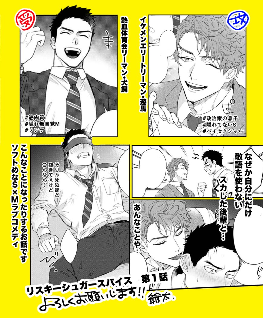 Qpa Vol.130にて24日より新連載「リスキーシュガースパイス」の1話が配信されます!熱血な体育会系サラリーマンと高学歴イケメンサラリーマンがSMチックにドタバタする話です👊よろしくお願いいたします〜! twitter.com/Qpa_BLinfo/sta…